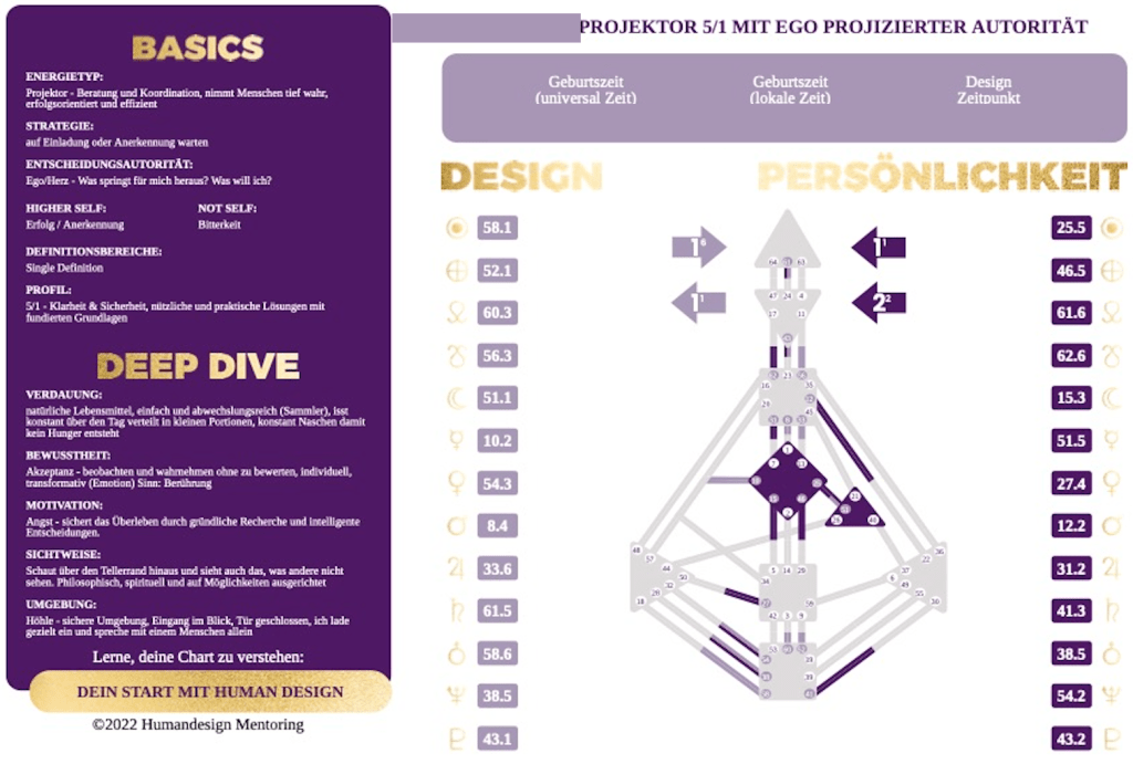 Human Design ist meiner Meinung nach das genialste System, das nicht getäuscht werden kann (außer du gibts falsche/ungenaue Daten im Chart-Rechner ein), um ein super hilfreiches Tool für Persönlichkeitsentwicklung, um Bewusstsein zu schaffen, für ein harmonischeres Miteinander in dieser Welt und, um einfach glücklicher, erfolgreicher das Leben zu leben.