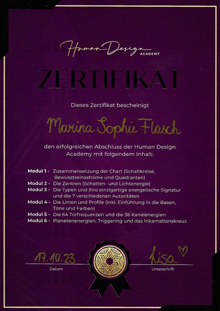YESSS! Meine Ausbildung – die so viel mehr als nur eine Ausbildung war, weil mich die Inhalte so weiter intensiv begleiten – habe ich erfolgreich abgeschlossen und darf mich nun HUMAN DESIGN (BUSINESS) COACH nennen 🙌